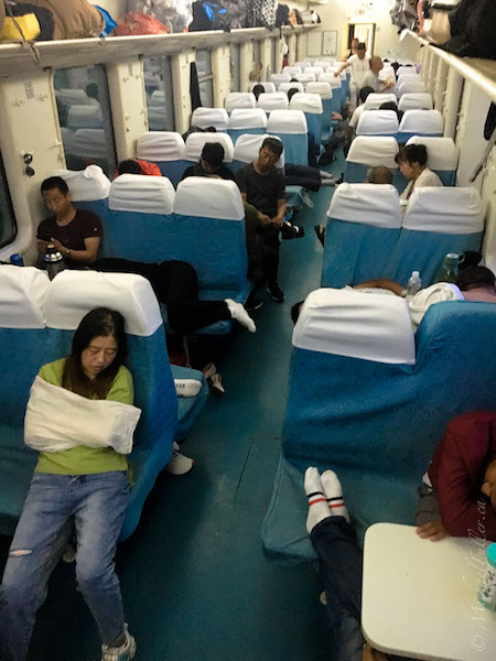We reluctantly bought the “hard-seat” tickets (literally the name of the ticket class, and a perfect description of what you receive) for the overnight train. I knew from my last trip that hard-seat overnight train rides in China are a very special kind of torture: Your mind begs you for sleep, but your body refuses, owing to the completely vertically-backed seats, men spitting loudly, people watching soap operas on their phones (a new addition since 2008), and the stench of shit and cigarette smoke wafting from the toilets (where everyone goes to ‘secretly’ smoke). At least these days, they only sell as many tickets as there are seats.